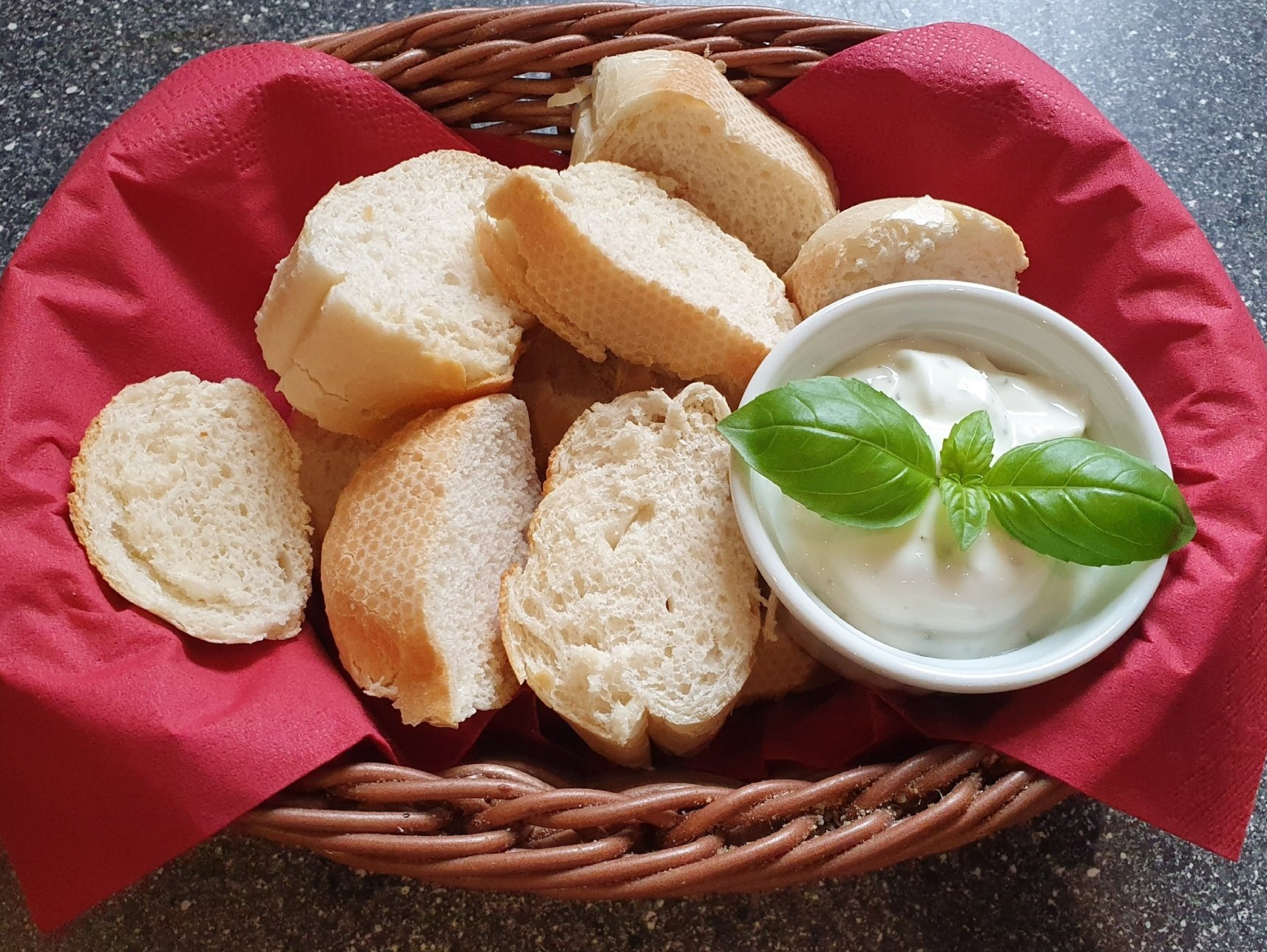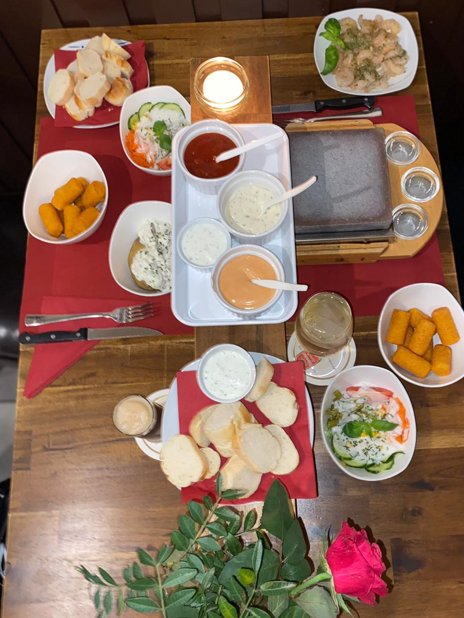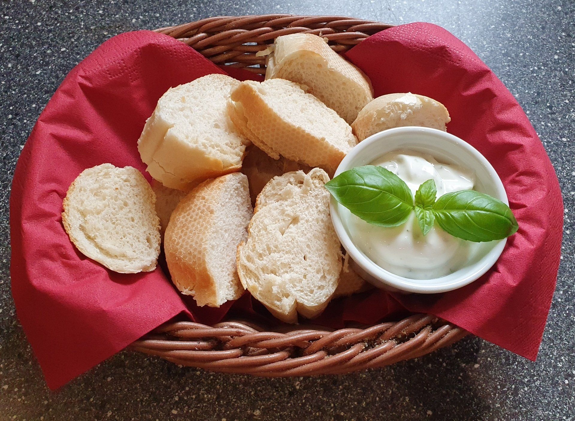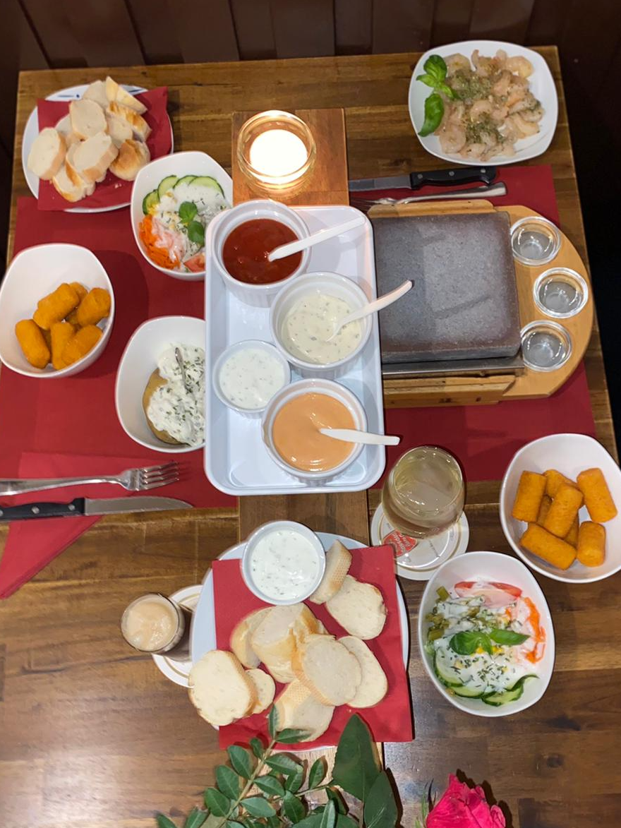 Zu allen Gerichten vom heißen Stein servieren wir Baguette, Aioli und drei verschiedene Saucen.